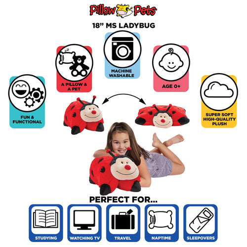 Our iconic Ms. Ladybug Pillow Pet is back for a limited time! Take a quick trip down memory road with this adorable ladybug! Simply sweet, fluffy and fabulously soft, this Pillow Pet is perfect for playtime, and a comforting cuddle buddy at bedtime. Surprise your little one with a Ladybug Pillow Pet that they will love endlessly as a child, snuggle with as a teen, and end up taking to college. Pillow Pets bring joy, security, comfort and smiles to all ages. Super soft, parent approved, fun and functional, high quality plush designs that last through childhood and beyond.