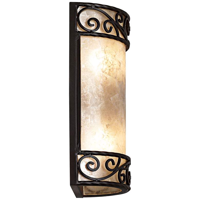 These wonderful antique-look wall mount fixtures come from the Natural Mica collection by John Timberland. Lavish scrollwork along the top and bottom of the sconce is complemented by a curved shade fashioned from naturally occurring mica. The walnut finish gives the design an old world appeal. Slight variations due to the natural tone and pattern of mica make each shade unique.