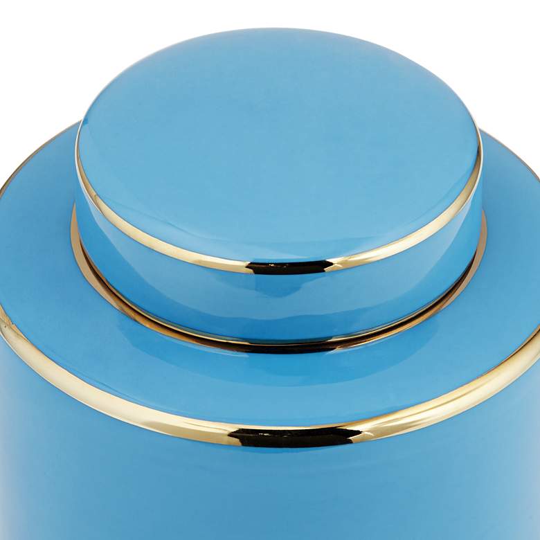 Porcelain construction lends delicacy to this contemporary round jar with a lid. Adding bright color with a shiny turquoise finish and gold accents that gleam in the light. Stash treats on a kitchen island or lend a pop of color to a decorative display.