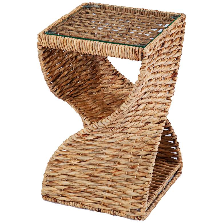 Add eclectic charm to your living space with this coastal water hyacinth side table. It's crafted with a charming natural finish over water hyacinth construction and iron frame. A 5mm tempered glass top, two storage shelves, and twist design adds style and convenience.