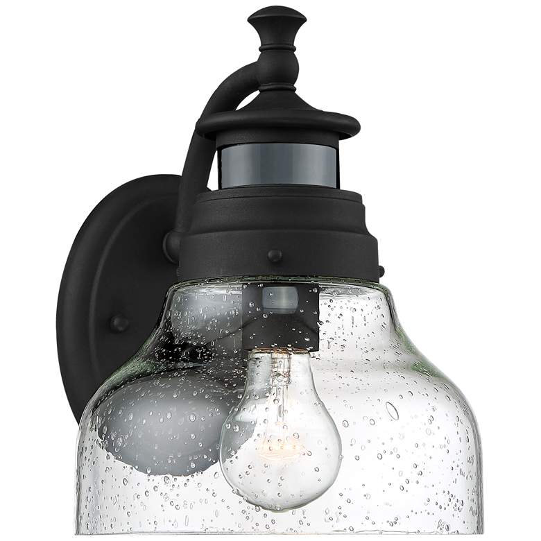 This classy outdoor wall light is perfect for contemporary or transitional settings. It comes in a black finish steel frame and has a clear seedy glass shade with an open bottom. This fixture also comes with a built-in motion sensor feature that turns on when it detects movement, adding an extra sense of security to your home. Also includes a dusk-to-dawn feature. Dual-bright design means the light turns on at 25% brightness and goes to 100% when motion is detected. Two minutes after motion is no longer detected, the light will revert to low-level brightness.