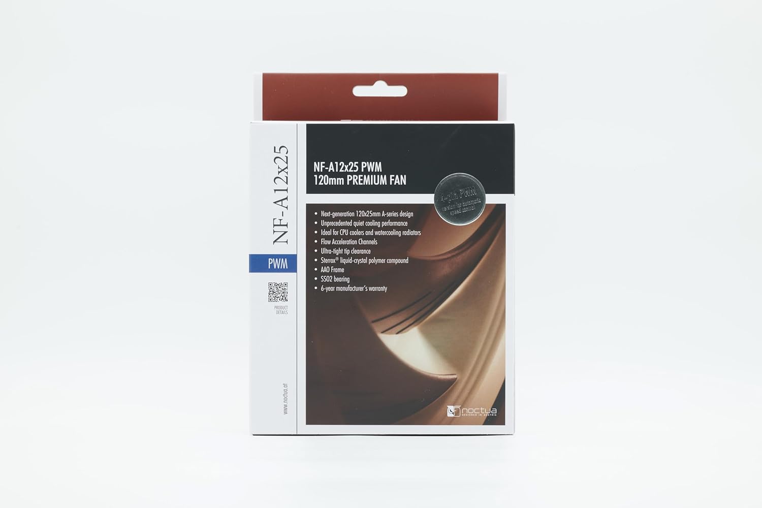 - Premium quiet fan, 120x120x25mm, 12V, 4-pin PWM, max. 2000 RPM, max. 22.6 dB(A), >150,000 h MTTF