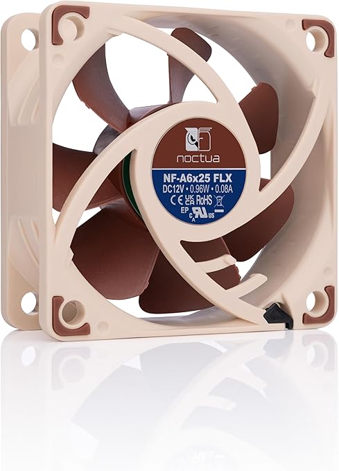 Award-winning 60x25mm A-series fan with Flow Acceleration Channels and Advanced Acoustic Optimisation frame for superior quiet cooling performance