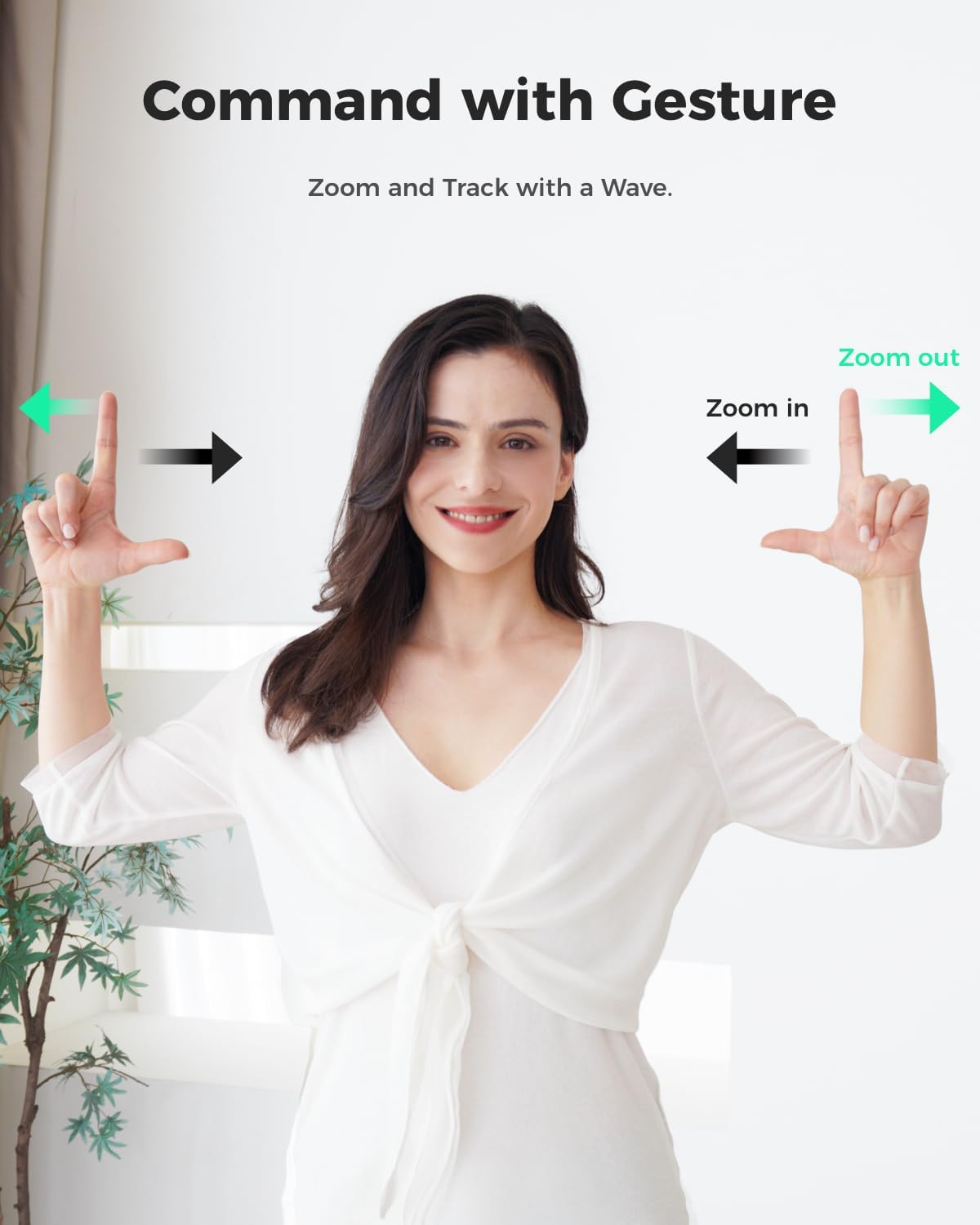 - 【Dynamic Gesture Control】Along with the 2.0 dynamic gesture control, say goodbye to cumbersome manual operation. Simply face our PTZ webcam, make an “🖐” gesture to lock the portrait tracking target, and make an “👆” gesture to control the zoom easily.