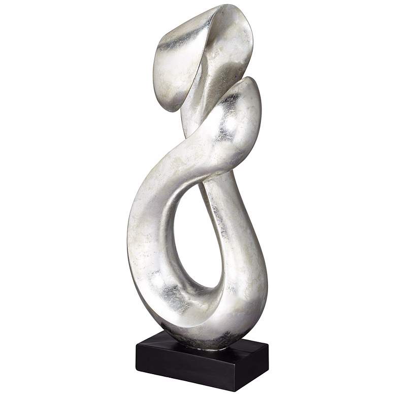 The silver leaf open infinity sculpture makes a bold, yet elegant, statement with its flowing design. Constructed from polyresin, and resting atop a black finish stand, this piece is breathtaking above a fireplace mantel.