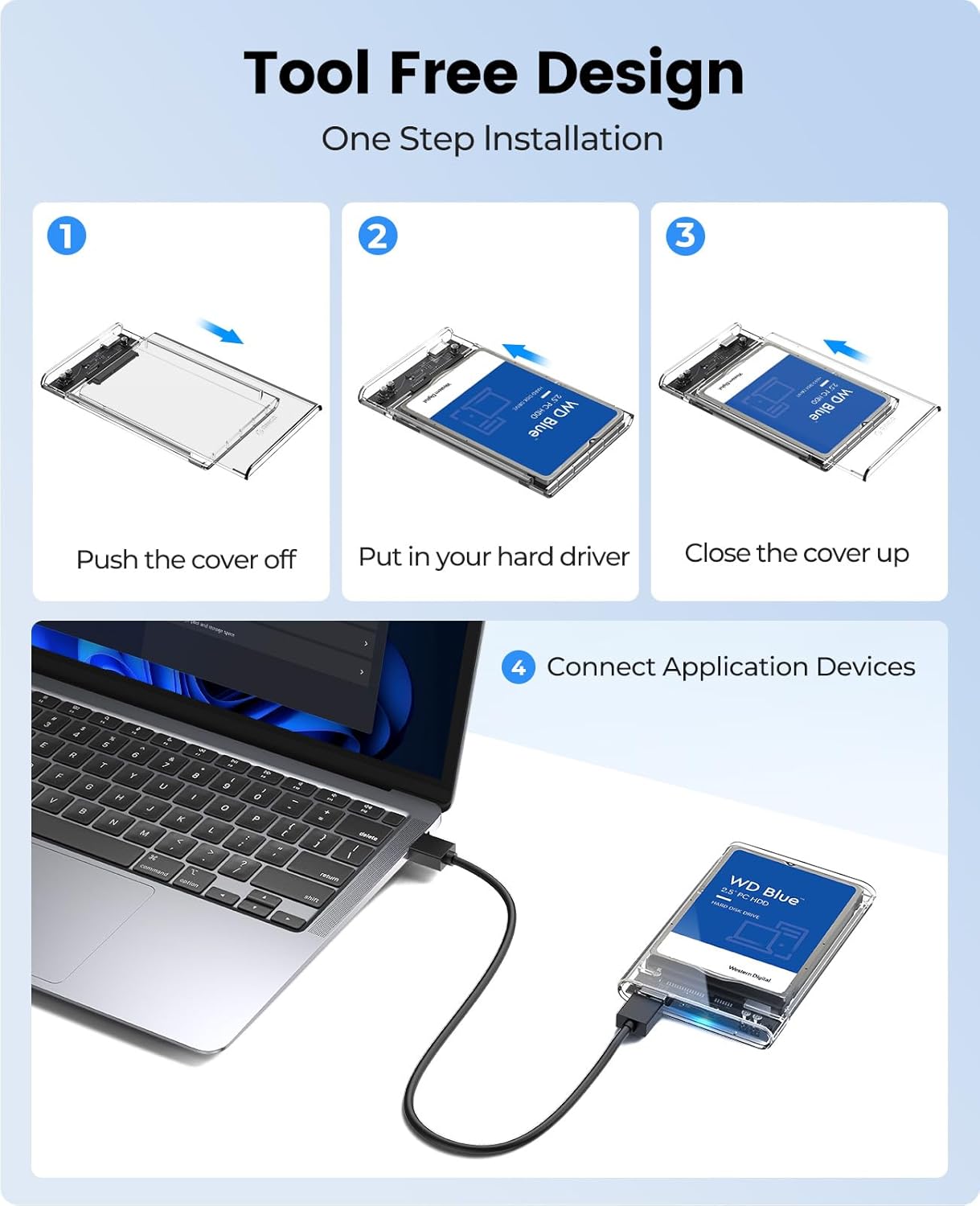 - Super Easy to Use: Tool free installation. Plug & Play, No driver needed for this SATA enclosure. Just push out the cover, plug in the drive, close the cover and go. Hot-Swappable. The blue LED indicator to let you know the working status of this hard disk enclosure easily