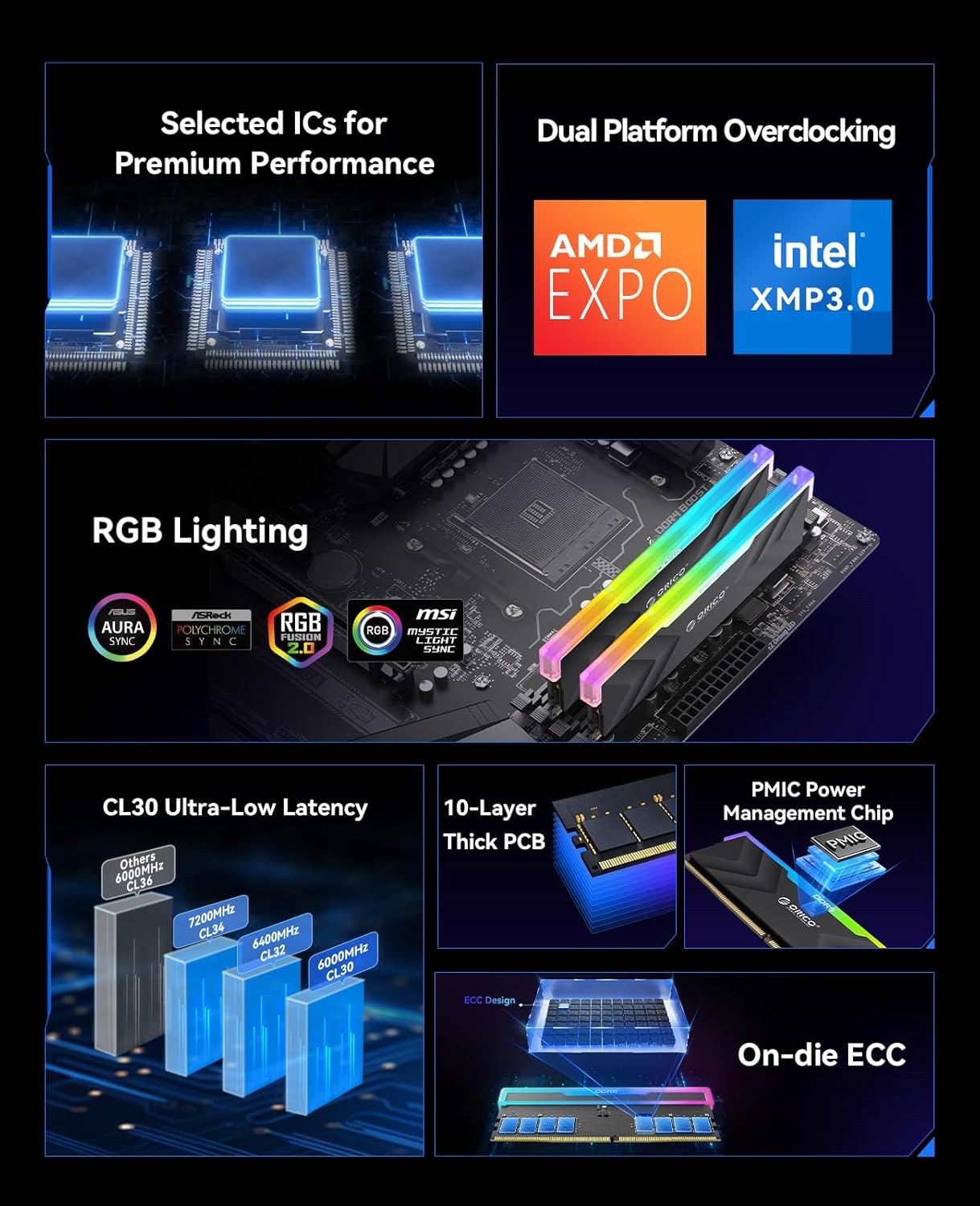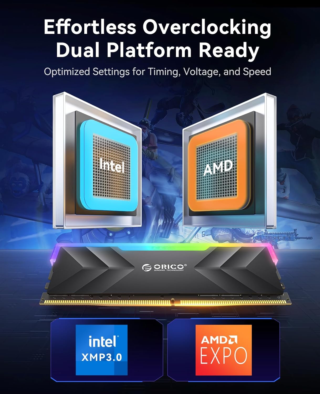 - 【Dual Platform Overclocking】ORICO DDR5 memory is optimized for both Intel and AMD platforms, featuring seamless compatibility with Intel XMP 3.0 and AMD EXPO for easy overclocking. Maximize performance effortlessly with one-click overclocking for smooth gaming and multitasking