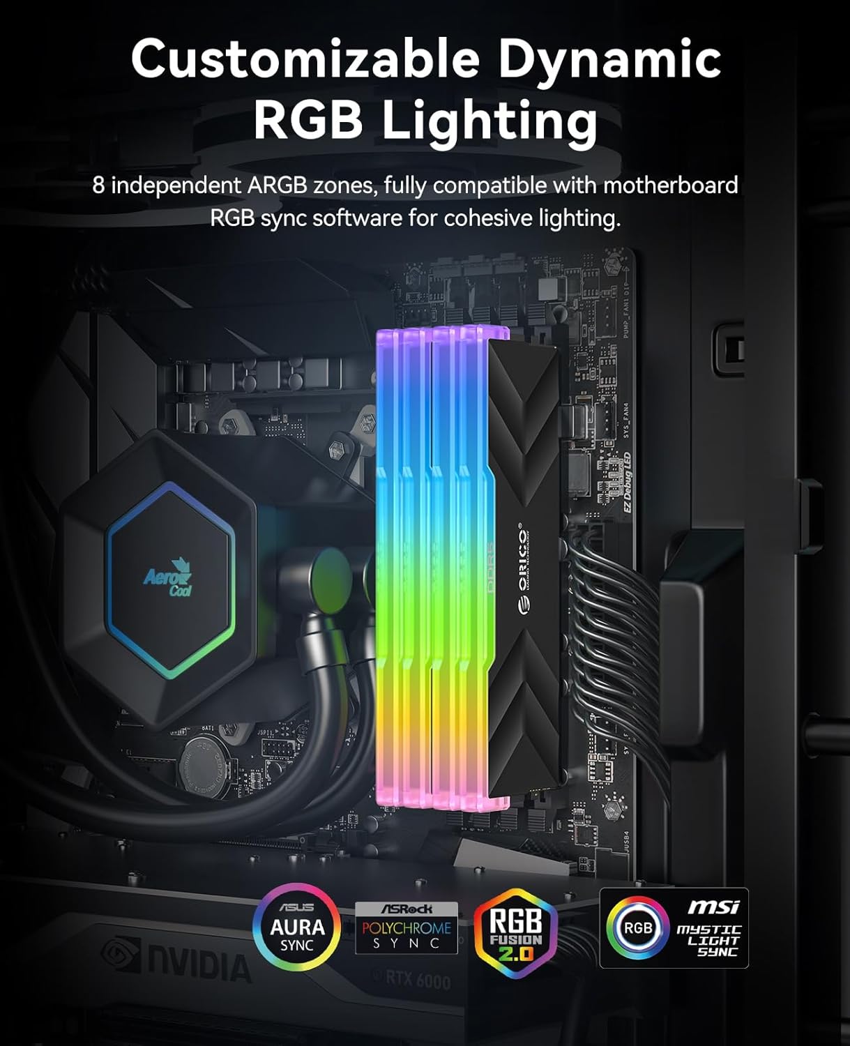 - 【Dynamic RGB Lighting】ORICO’s memory module features 8 individually addressable RGB LEDs for customizable lighting effects. Fully compatible with ASUS Aura Sync, MSI Mystic Light, and Gigabyte RGB Fusion ecosystems, delivering seamless synchronization for a vibrant and unified system-wide aesthetic