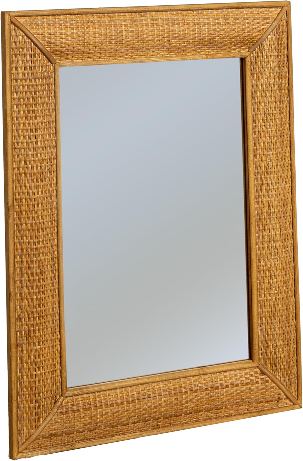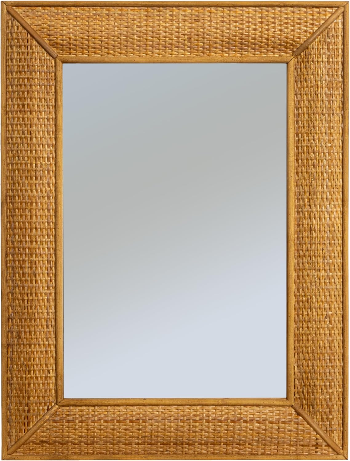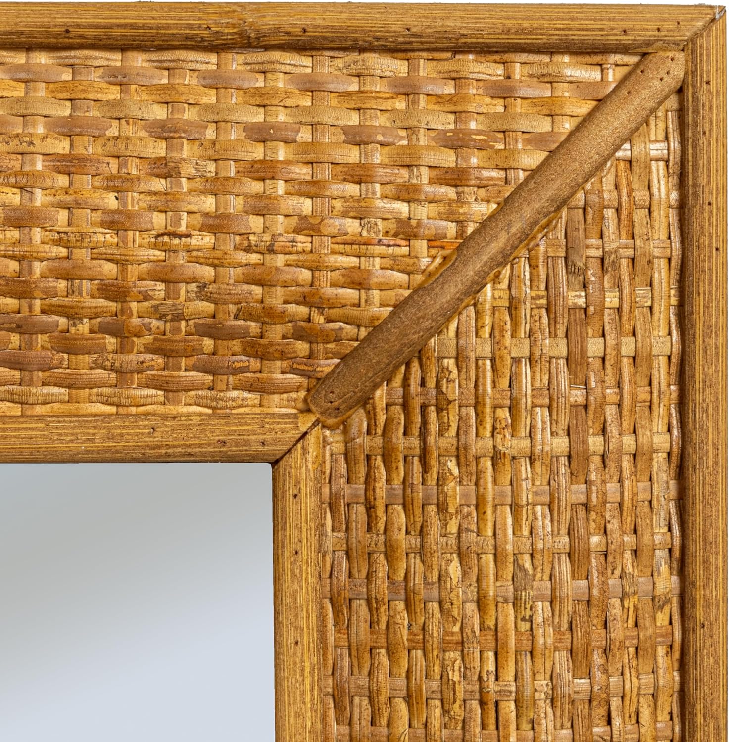 - A beautiful wall mirror with a wood frame and an intricately woven rattan detail in a brown finish