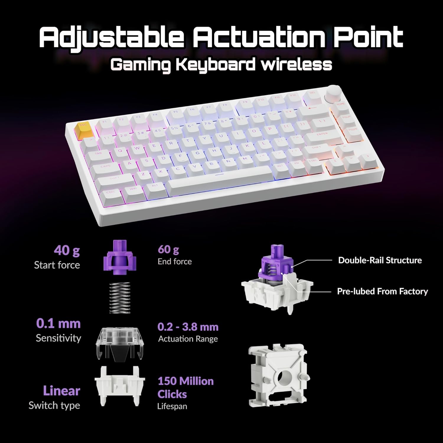 P1 HE 75% Wireless Custom Mechanical Gaming Keyboard with Gateron Double-Rail Magnetic Switches Knob Version, QMK 2.4 GHz Bluetooth 5.2 RGB Backlight Compatible with Mac Windows Linux-White