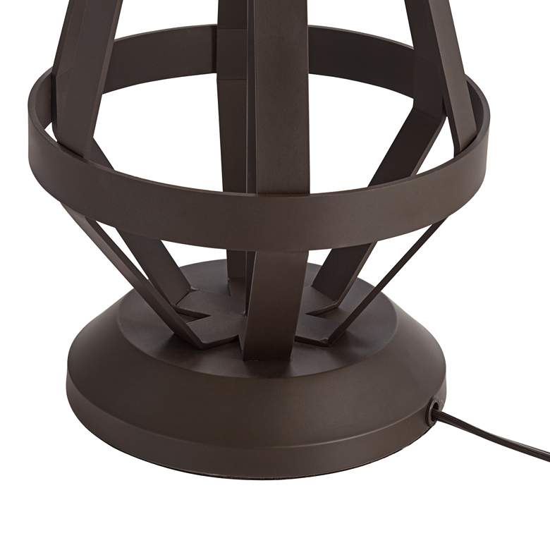 - Matte bronze finish base with an open triangle design. Metal construction. 8-foot long cord.