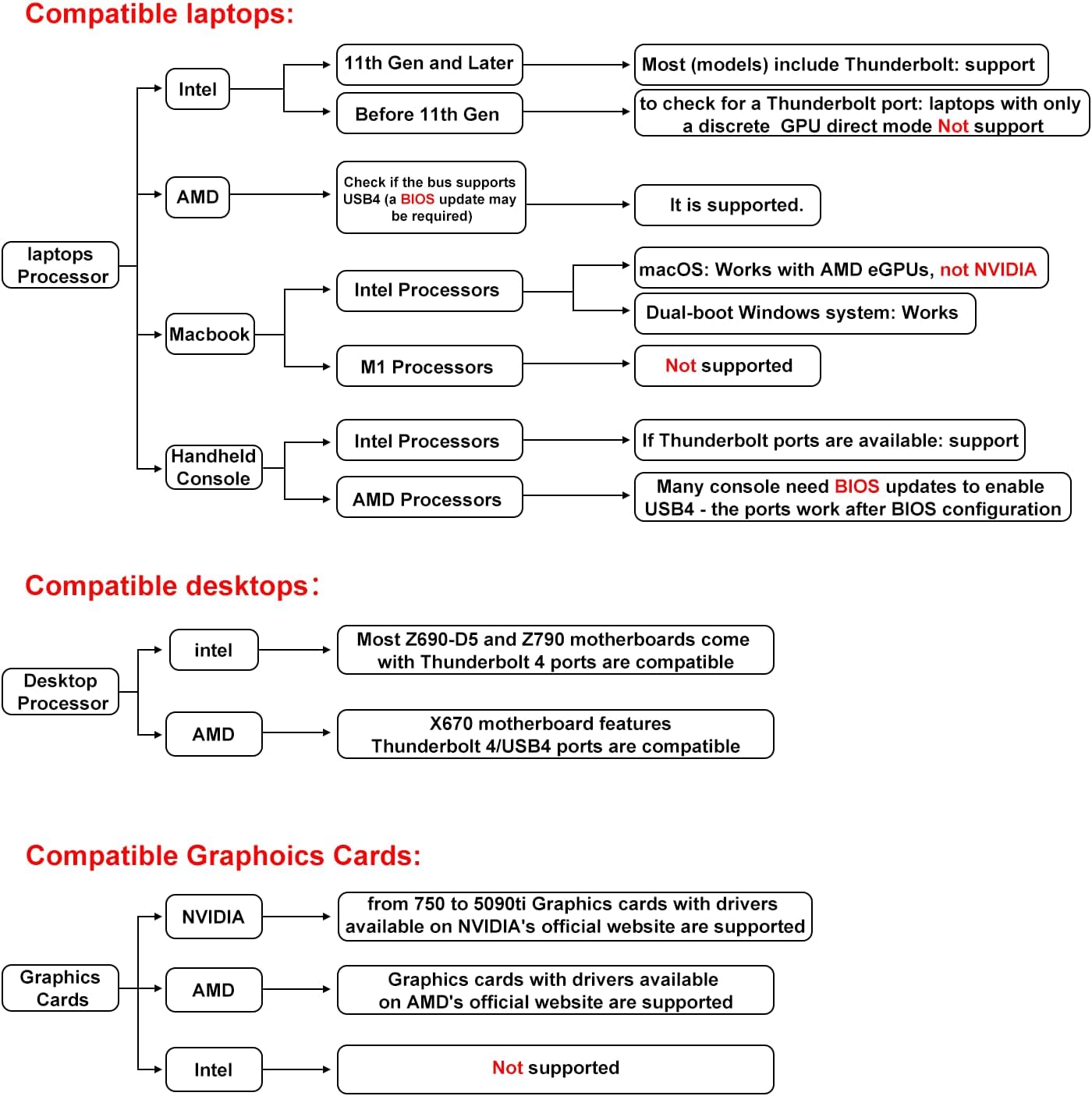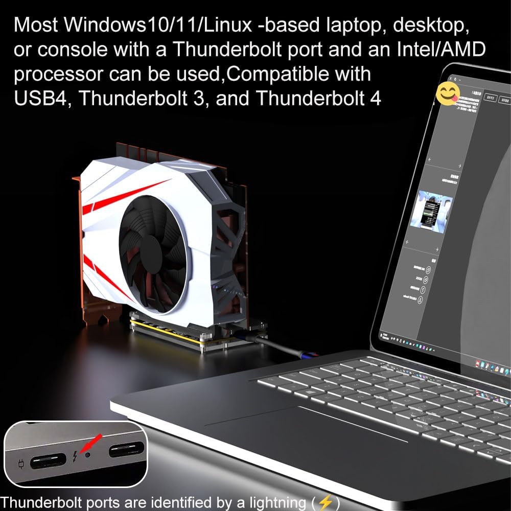 - Compatible devices: Most Windows10/11/Linux -based laptop, desktop, or console (including the Lenovo Legion Go) with a Thunderbolt port and an Intel/AMD processor can be used (some console with USB4 may require a BIOS update to enable USB4 functionality), Compatible with USB4, Thunderbolt 3, and Thunderbolt 4