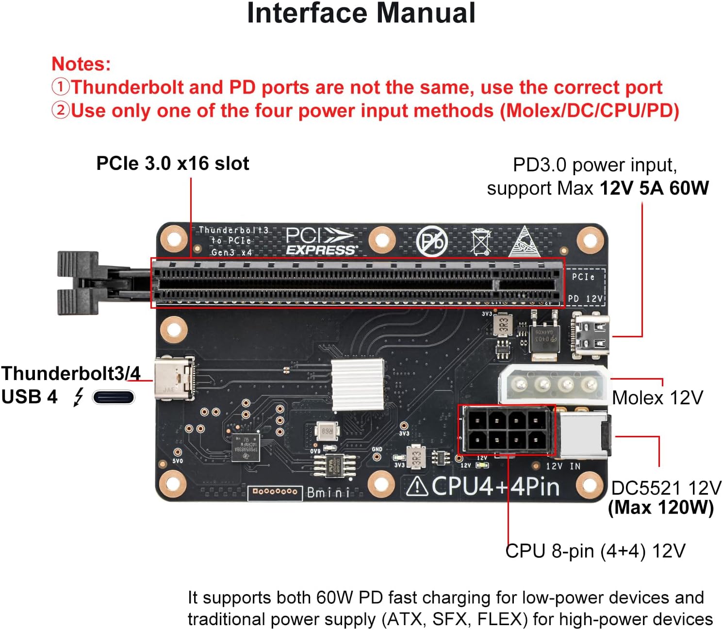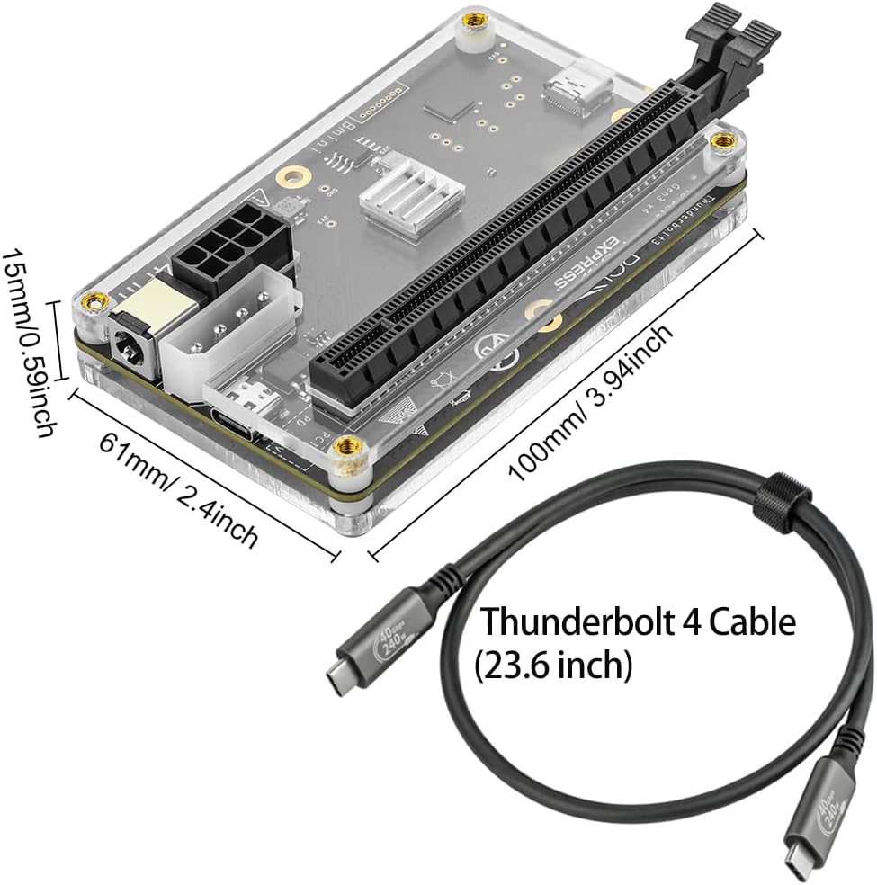 - Packing Includes: PCIE 3.0 x16 eGPU Dock withThunderbolt Port, High-quality Standard Thunderbolt 4 Cable (23.6 inch), a 24Pin Power Jumper Cable