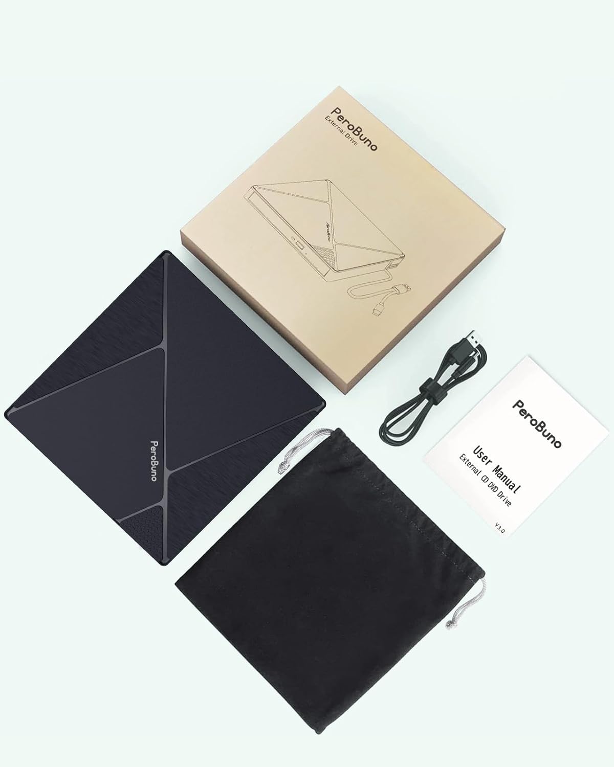- 【What You Get】PeroBuno External CD/DVD Drive *1, USB A to DC Power Supply Cable*1, Drive Storage Bag*1, User Manual*1, PeroBuno up to 24-month after-sales service, and 7-day/24-h friendly customer service. If you have any problems, we will 100% solve them.