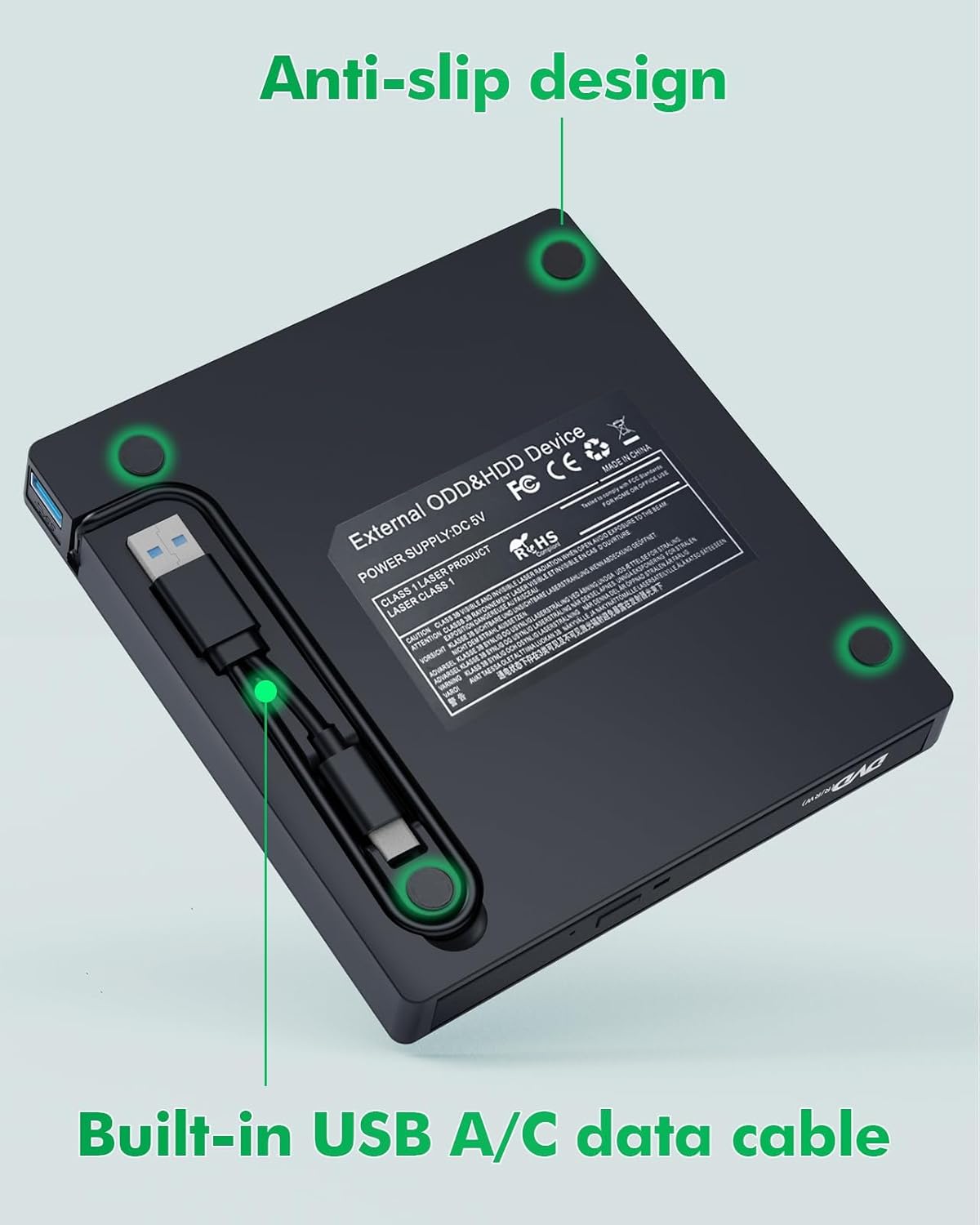 - 【Compact and portable design】- This external cd dvd drive for macbook is very slim and lightweight, embedded USB A/C data cable, come with a storage bag, which is easy to use and easy to carry. The skip-proof rubber pad prevents sliding on the desktop. The external cd dvd drive for pc is the best choice for home, office and travel.