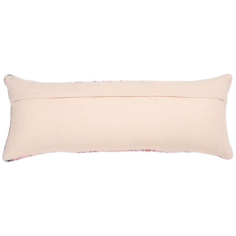 - Mix of pink, purple, and red hues in an oriental woven textured pattern on the front. Solid pink on the back.