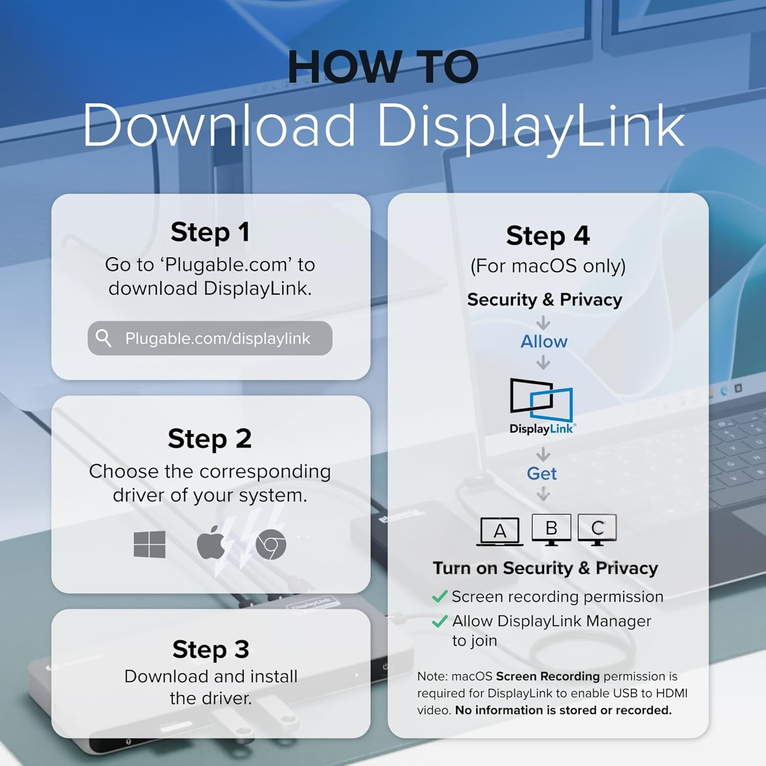 - Compatibility: Compatible with Windows 11/10/8.x/7, macOS 10.14+ (driver required) and ChromeOS 100+. This laptop docking station offers plug-and-play functionality for Windows and ChromeOS. Not compatible with Linux; manual driver installation required on Mac. Please note, this docking station does NOT charge the host computer
