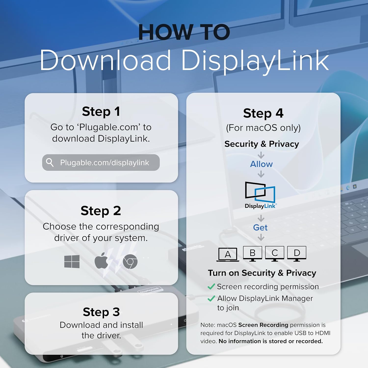 - Compatibility - Universal docking station for laptop compatible with Windows 11, 10, 8.x, and 7 systems, macOS 10.14+ (Driver Required), and ChromeOS 100+. Plug and play driver installation via Windows Update. On macOS, the DisplayLink driver must be manually installed for displays to work Linux not supported.
