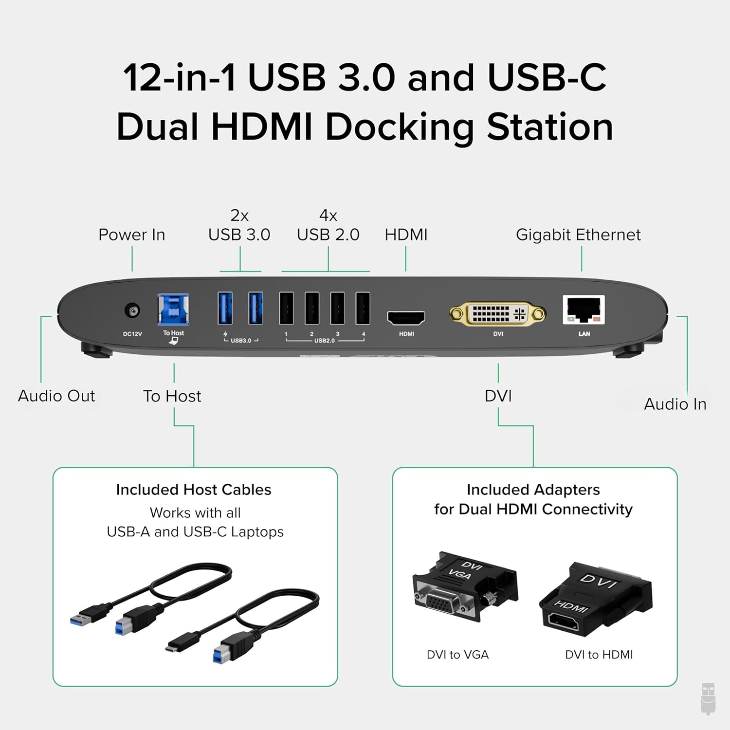 - Universal Docking Station: This USB and USB C docking station (UD-3900H) offers flexible expandability for modern and legacy laptops. With 12 port expansion including dual video outputs, and broad compatibility, this DisplayLink docking station is great in mixed laptop environments