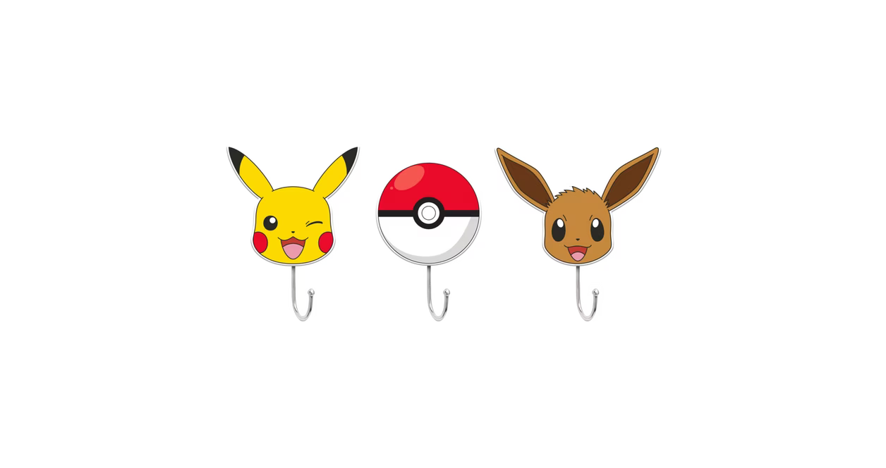 The perfect addition to any Pokemon fan's home! This 3-piece die cut wall hook set features 3 unique designs: Pikachu, Eevee and a Pokeball.