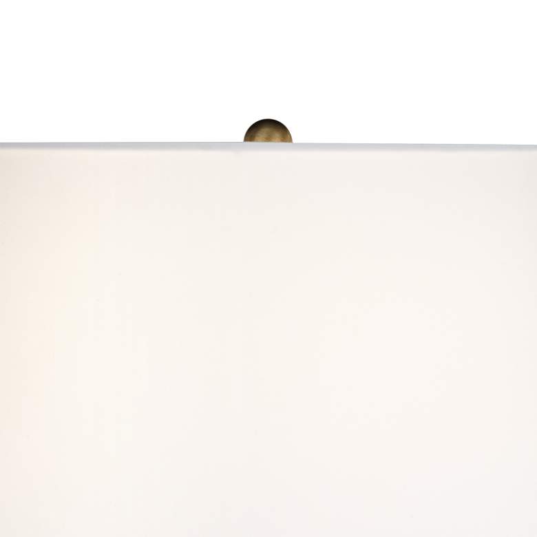 Bright, glossy teal is the highlight of these temple jar-style ceramic table lamps. The curved bases are textured and are accented by an antique brass finish foot and neck. Up top, crisp white empire shades diffuse the light in modern style. A round, antique brass finish finial completes the look. Please note that because of the handmade nature of the lamp bases, there may be slight variations in pattern and color.