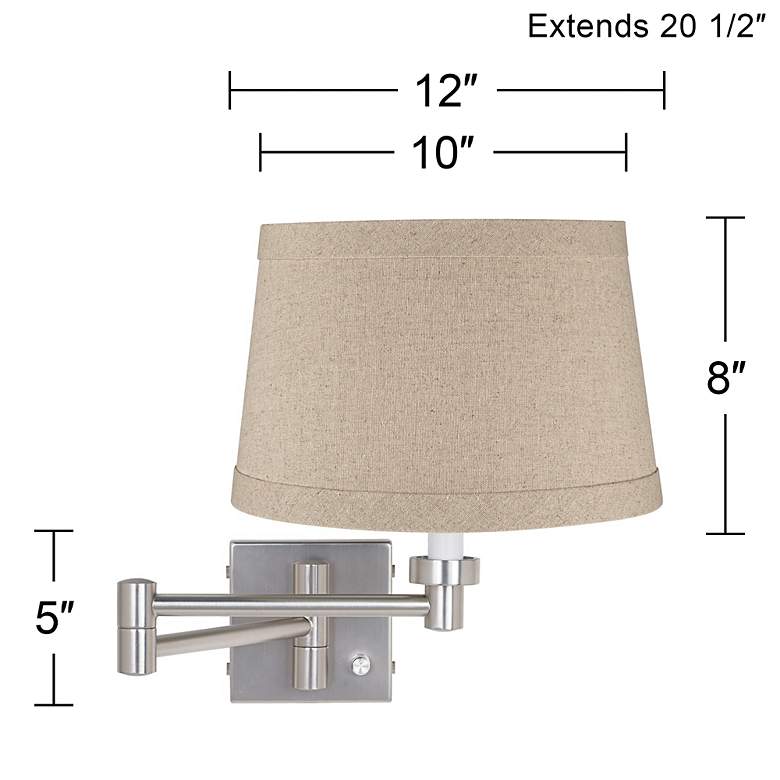 Enjoy a set of two swing arm wall lamps in the bedroom, living room, or office. Each plug-in style brushed nickel wall lamp features a contemporary square wallplate and is complemented by lovely natural linen drum shades. The wall lamps come with a full-range dimmer for easy light control. Each wall lamp also includes 8 feet of cord that plugs into any standard outlet.