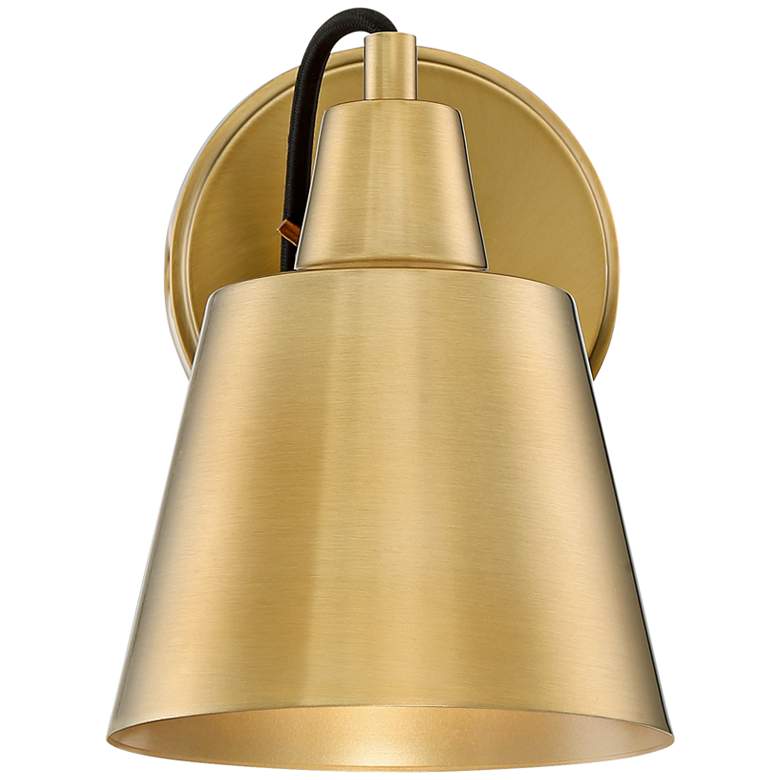 - Warm brass finish. 9" long black braided cord. Wall mount only.