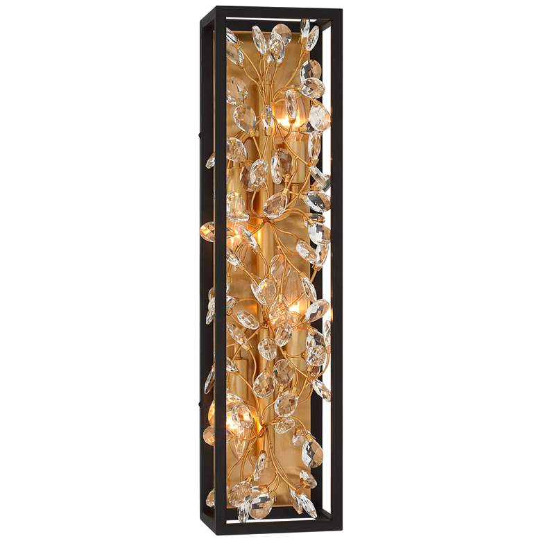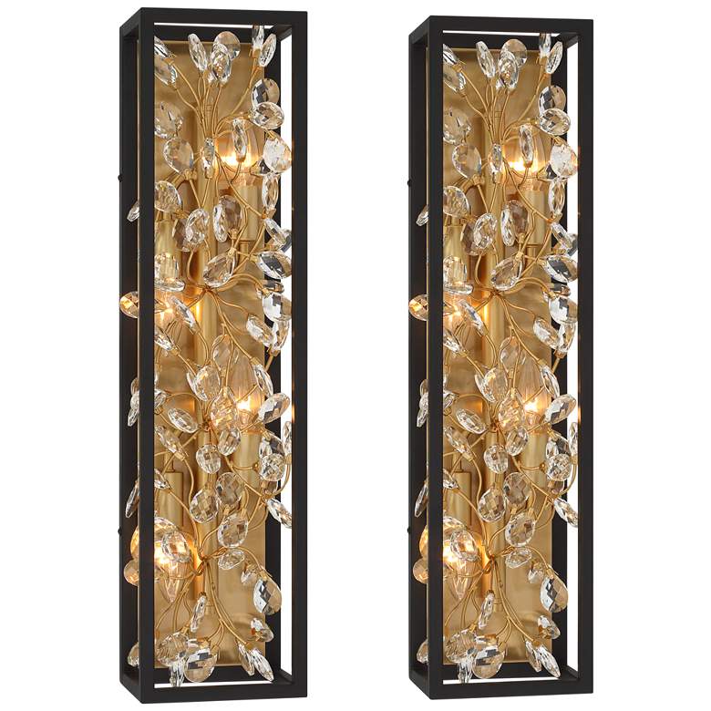 Take nature-inspired decor to the next level with this set of two contemporary four-light bath lights from Possini Euro Design. The open rectangular frame comes in a sand black finish, and inside is a riot of crystal buds on golden branches. Designed to take four bulbs (not included), this vanity light will bring maximum sparkle and style to your master or guest bath.