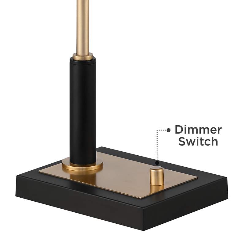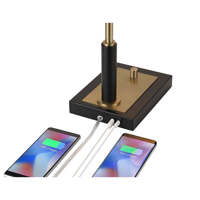 Focus light where you need it with this antique brass and black desk lamp featuring a USB port. From the Possini Euro Design brand, the lamp's luxe design includes contrasting black and antique finishes over its metal construction. A dimmer switch on the base lets you control the light with ease, and a USB port on the back allows you to charge smart phones and other devices while you work. Move the shade left, right, up or down to best suit your needs.