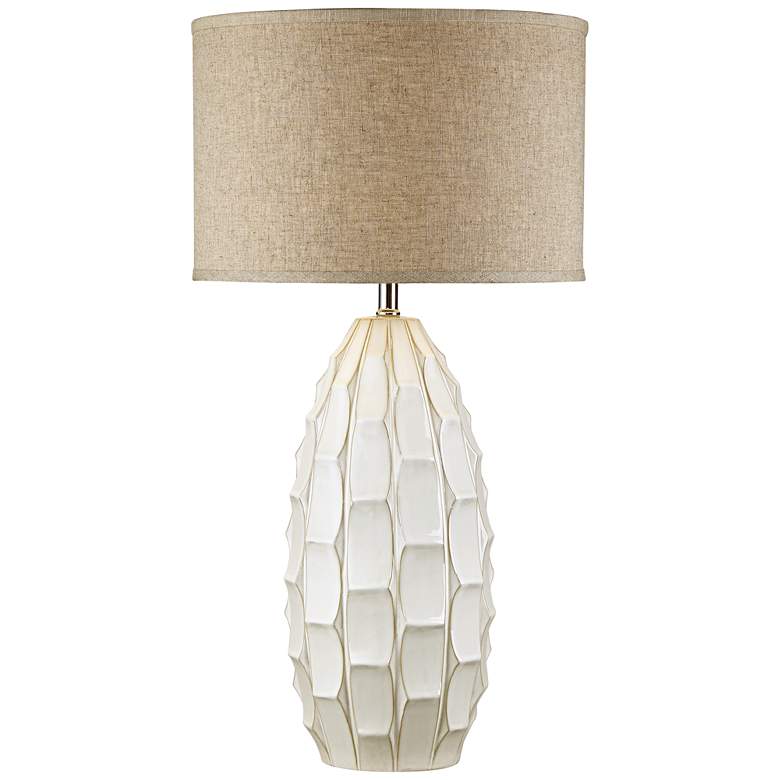 From Possini Euro Design comes a modern table lamp that balances a sense of upscale aesthetics with a dash of experimentation to create a compelling look in lighting. The white finish pairs perfectly with the textured ceramic body. A neutral drum shade provides a touch of warmth, making this a versatile look that matches a variety of decorative themes.