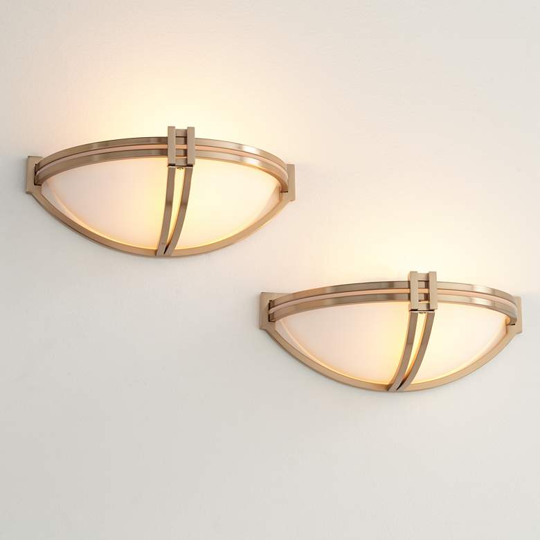 Influenced by classic Art Deco designs, this set of two contemporary pocket wall sconces from Possini Euro Design® is sure to provide stylish lighting for your home. It features a soft gold finish frame with gracefully curving lines. Milky white marbleized glass adds an elegant finishing touch. The sconce is open at the top and is designed for horizontal installation only as shown.