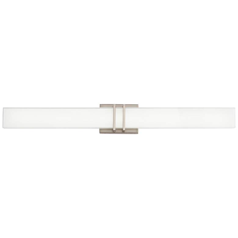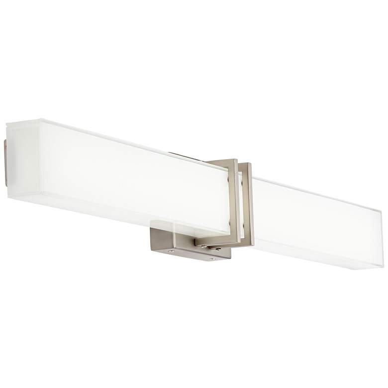 Upgrade your vanity bathroom with the sleek, modern look of this set of two linear bath lights. This bathroom wall light features a rectangular silk-screen glass shade set against a brushed nickel finish backplate. Energy-efficient LED modules are built directly into the design to provide power-saving lighting. Can be installed vertically or horizontally.