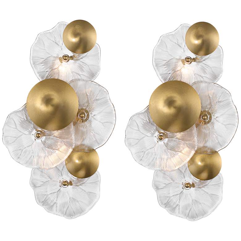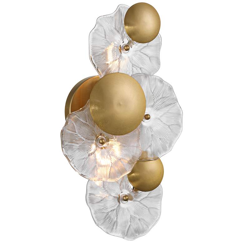 The Filoli two light wall sconce, from the Possini Euro Design® brand, functions as both a versatile lighting option and work of wall art. Gold plated finish rounds add a splash of color, enhanced by the textured clear glass diffusers, creating a glam - luxe flower pattern. The Filoli sconce utilized two bulbs for beautiful ambient illumination.