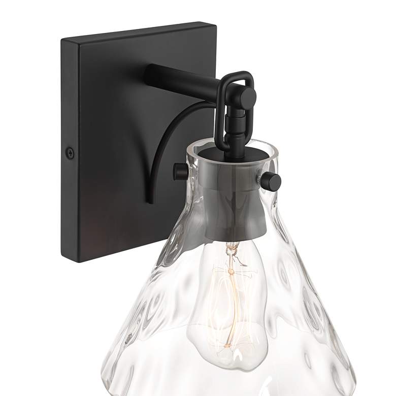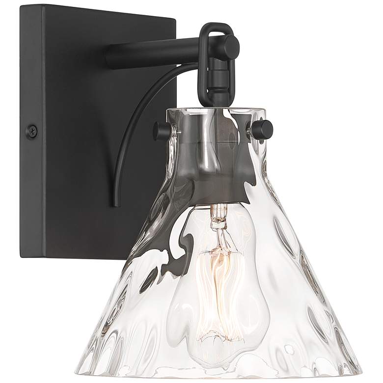 With strong lines and an easy sensibility, the Ishii wall sconce from the Possini Euro Design® brand is here to elevate your home lighting. The strong frame comes in a modern matte black finish, serving to enhance the dimpled clear glass shade. One bright light provides unfiltered illumination, perfectly suited for a hallways or framing a doorway or mirror.