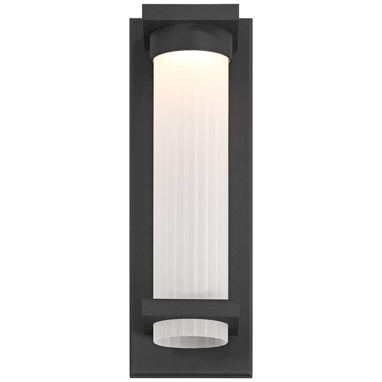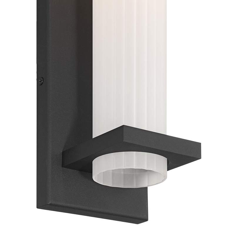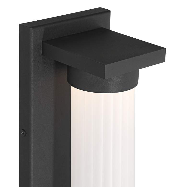 Adorn your home with the minimalist charm provided by the Kathleen wall sconce, from the Possini Euro Design® brand. A classic sand black finish works in tandem with a ribbed white glass shade to create visual interest, housing an integrated LED module for bright, diffused illumination. This fixture is wet location rated for indoor use.