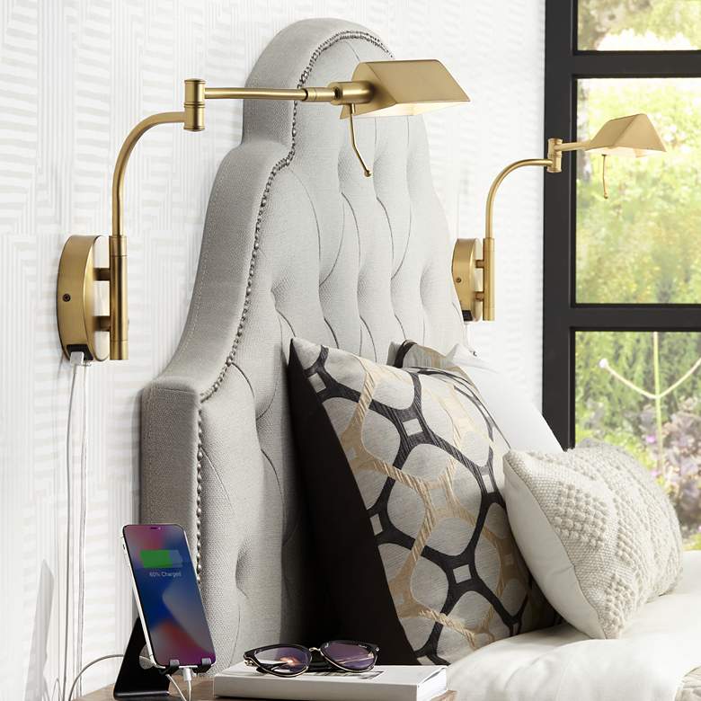 - Plug-in swing arm USB wall lamps. Dual USB charge ports on the wall plate. Design from the Possini Euro Design collection.