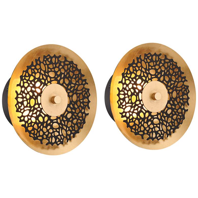 The Kora wall sconce set of two from the Possini Euro Design® brand is a contemporary modern addition to your home. A two-tone black and gold leaf finish sets a radiant look to any room, filtering illumination from the energy-efficient LED module housed a the center of the piece. The Kora wall sconce is rated for indoor use.