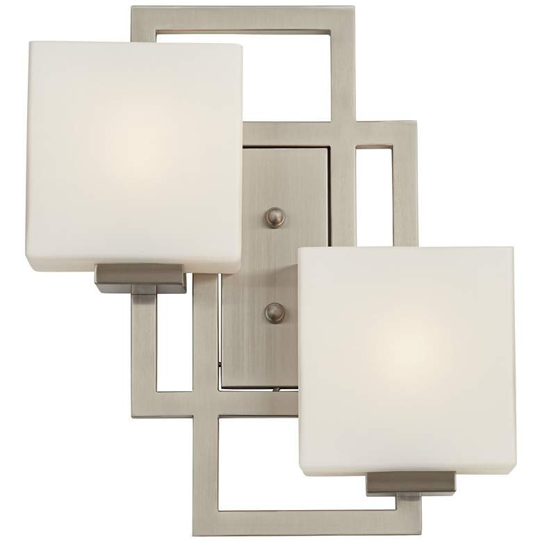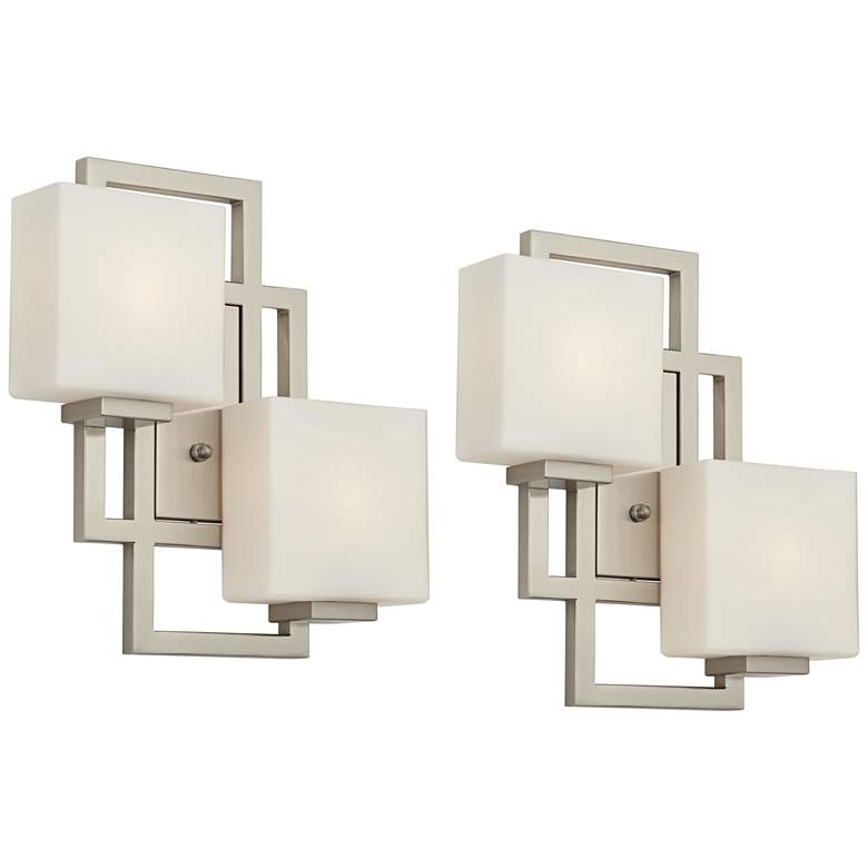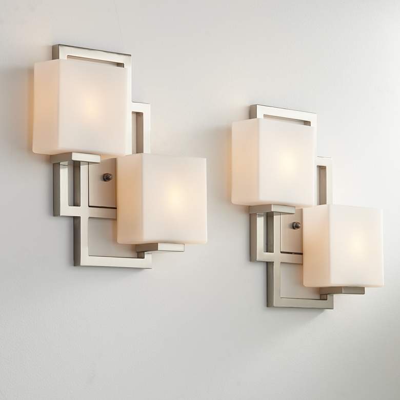 This set of two brushed nickel two-light wall sconces features sleek lines for a contemporary appeal. The square shades of opal glass are positioned to complement the geometric form of this design. A great modern update for