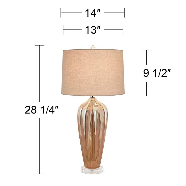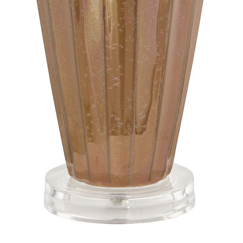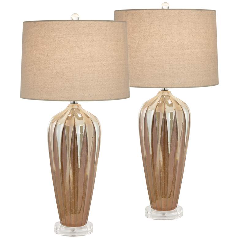 Featuring a warm earth-toned color, these tapered ceramic table lamps feature an ivory drip design for a striking effect. The stylish look sits on top of a clear acrylic base for a modern touch. A drum lamp shade sits on top of each lamp. Since each ceramic base is handmade, there may be slight variations in pattern and color.