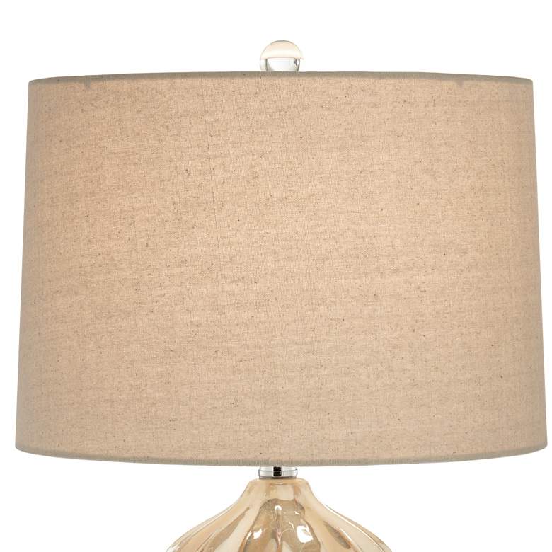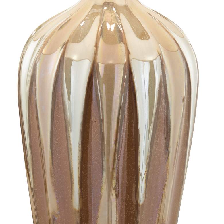 - Hand-applied ivory drip ceramic glaze. Each lamp will vary slightly in color and pattern. Round acrylic accent at the very bottom.