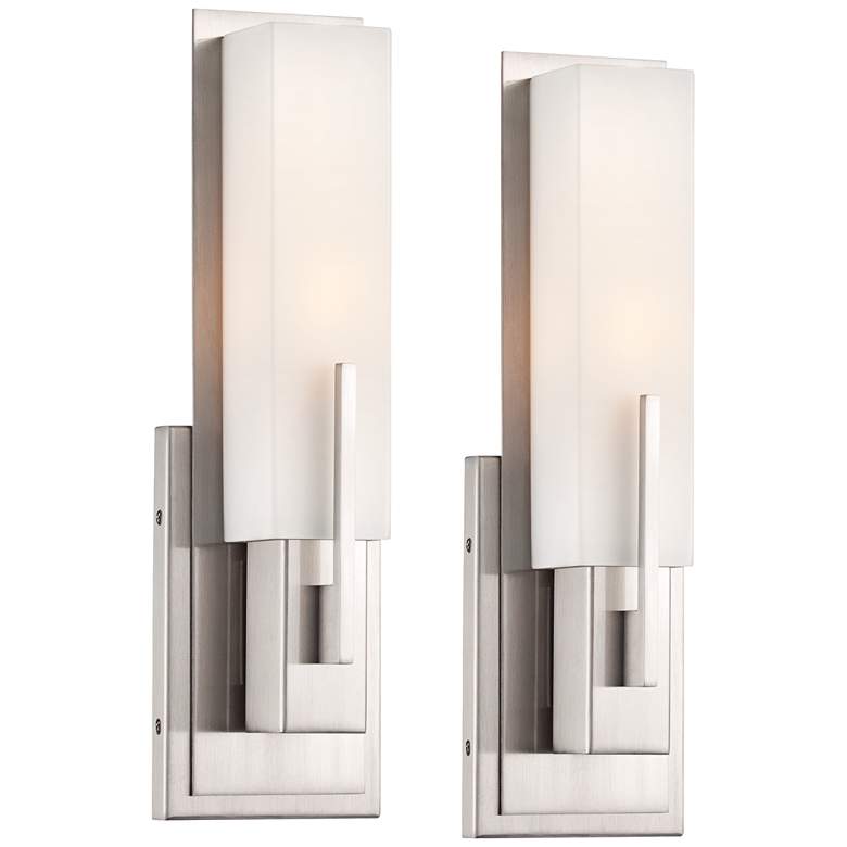Add a comforting contemporary look to your bath or hallway with this set of two white glass and satin nickel wall sconces from the Possini Euro Design Midtown collection. Attractive and versatile transitional style sconce fixture features a vertically-oriented, rectangular white glass shade above a rectangular wall plate in lustrous satin nickel finish. The design is even ADA compliant to ensure a perfect fit for any indoor space. This chic light will bring a new look to any part of your home.