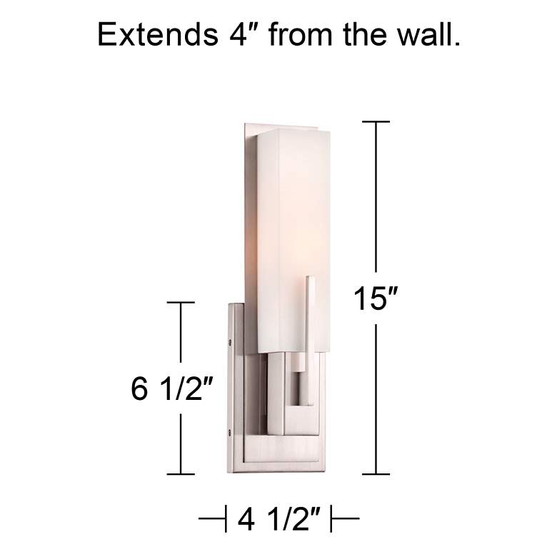 - Each is 15" high x 4 1/2" wide. Extends 4" from the wall. Center of mounting point to top of fixture is 11 3/4". Backplate is 6 1/2" high x 4 1/2" wide. Weighs 1.8 lbs.