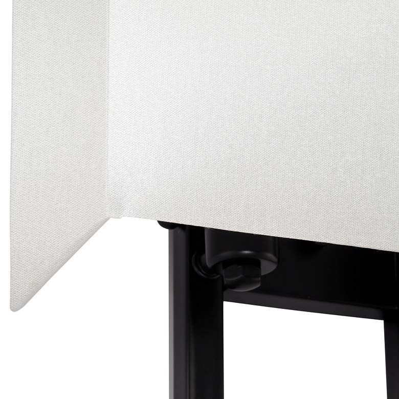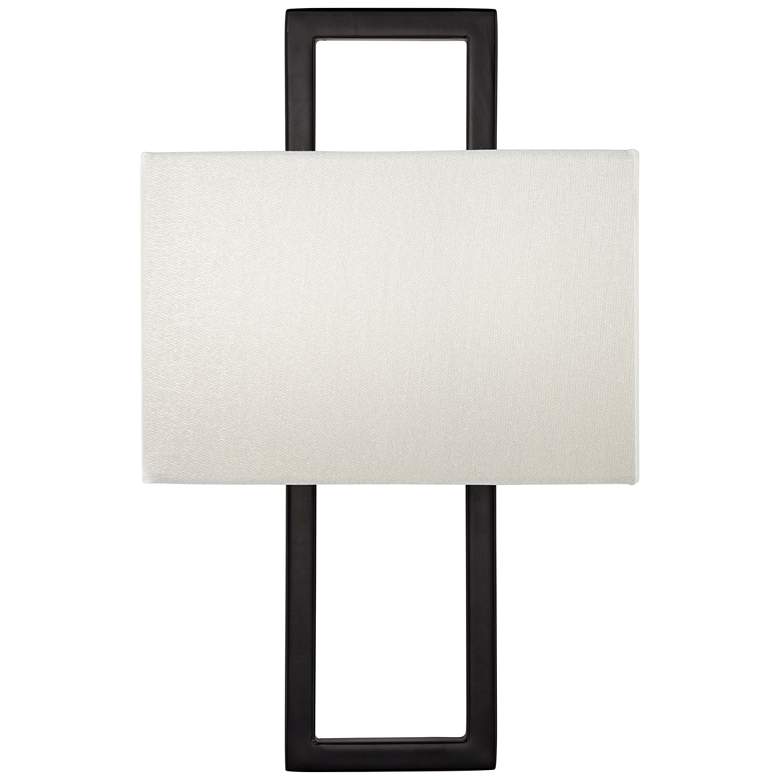 This set of two modern wall sconces is as beautiful as it is simple. An open rectangular frame in a black finish is paired with a horizontal rectangle half-shade for a light, airy look. The shade is made of a shimmery faux silk material that is designed to catch the light. Designed to take two bulbs, it provides excellent lighting for a hallway, bedroom, or bathroom space.