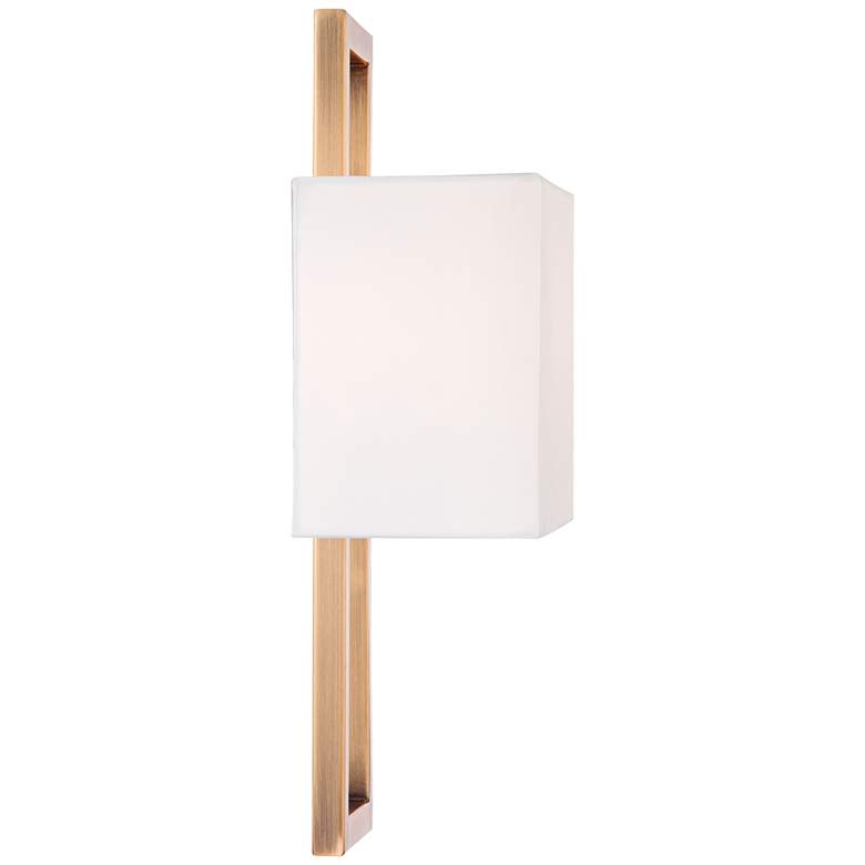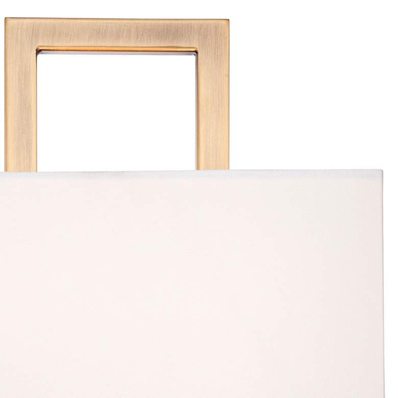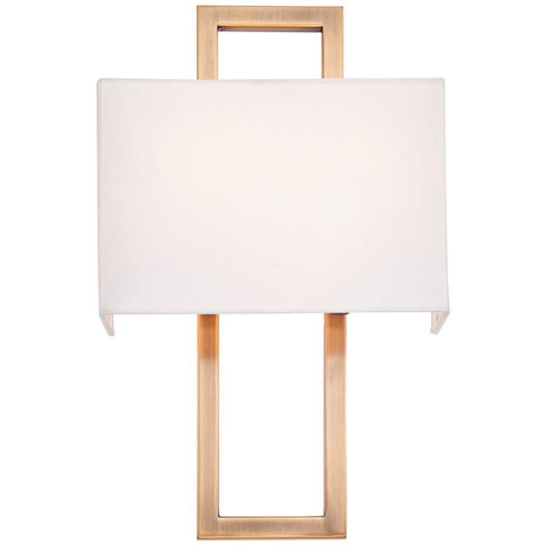 This set of two modern wall sconces is as beautiful as it is simple. An open rectangular frame in a French brass finish is paired with a horizontal rectangle half-shade for a light, airy look. The shade is made with an off-white faux silk material. Designed to take two bulbs, it provides excellent lighting for a hallway, bedroom, or bathroom space.