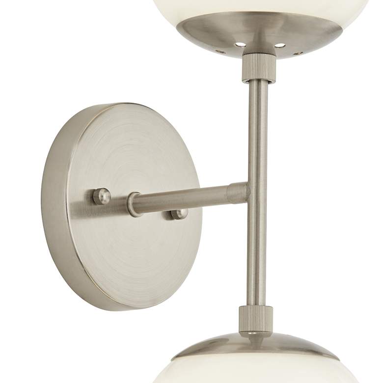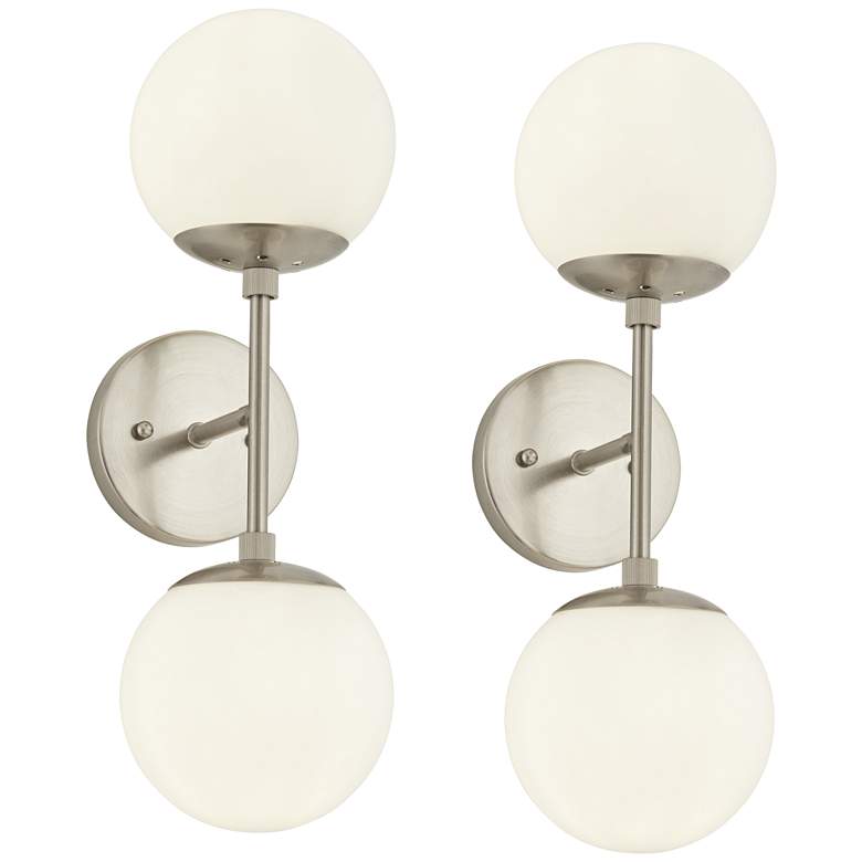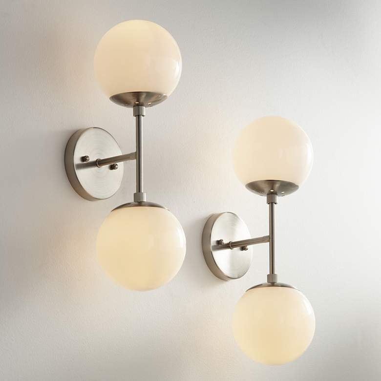 Bring a bit of space-age style to your home with this set of two two-light wall sconces from Possini Euro Design. This wall light features two opal glass orbs and a sleek brushed nickel finish. Inspired by Sputnik-style lighting fixtures, it's the perfect addition to a contemporary or Mid-Century Modern setting.