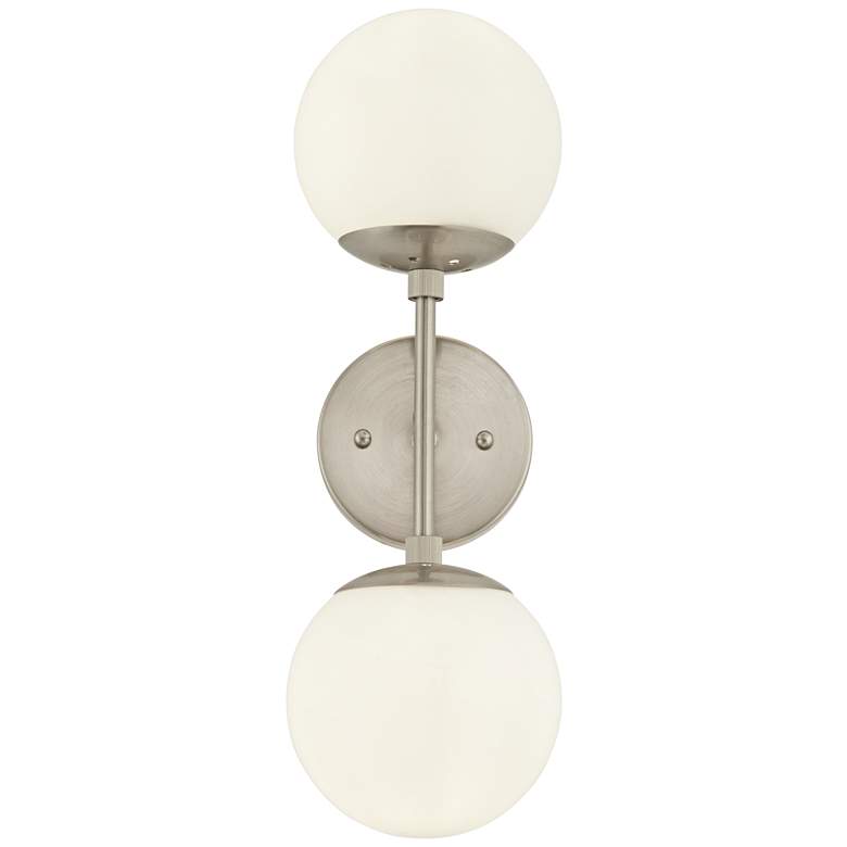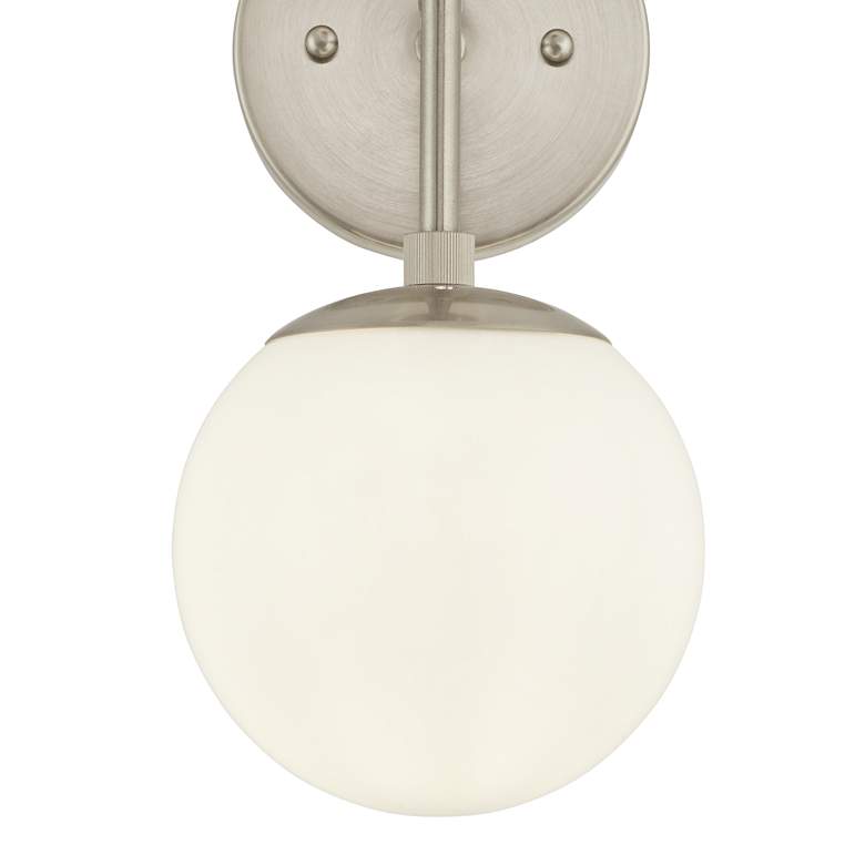 - Opal white glass orbs.Brushed nickel finish wall plates and arms. Metal construction.