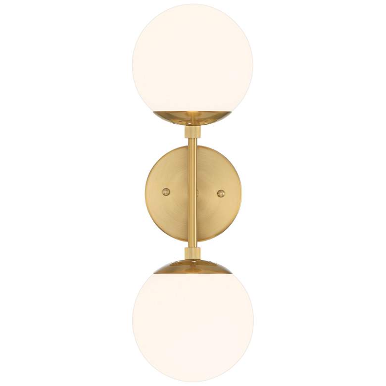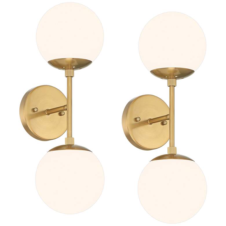 Bring a bit of space-age style to your home with this set of two modern two-light wall sconces from Possini Euro Design®. This wall light features two opal glass orbs and a vintage-style soft gold finish. Inspired by Sputnik-style lighting fixtures, it's the perfect addition to a contemporary or Mid-Century Modern setting.