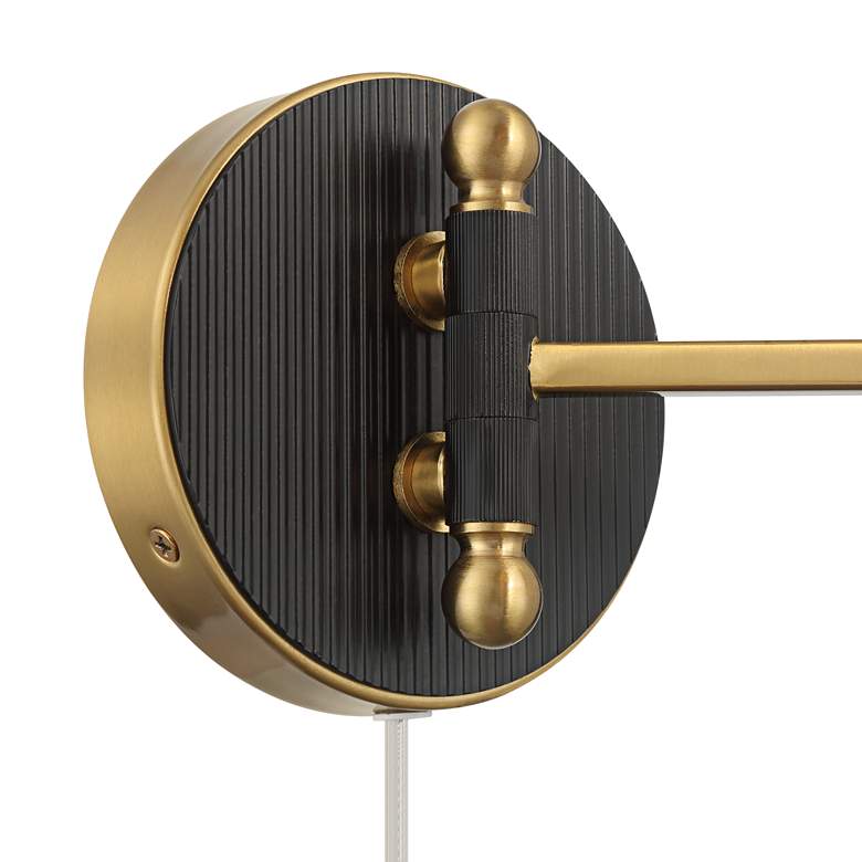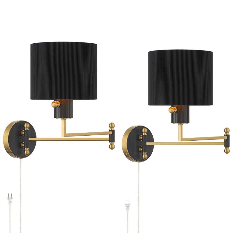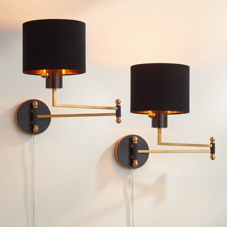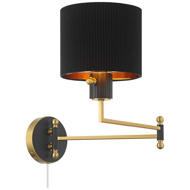 Bold and impressive, Possini Euro Design® introduces the Rumi swing-arm plug-in wall lamp, ready to bring that dramatic flair to your home. A mixed metals look featuring black and gold finishes embraces modern elegance, providing a beautiful contrast between dark and light. The look is completed by the pleated black fabric drum shade, featuring a gold inner lining, enhancing illumination from the bulb. Suitable for any room in your home, the Rumi wall lamp is a versatile plug-in design featuring a swing-arm for adjustable extension.