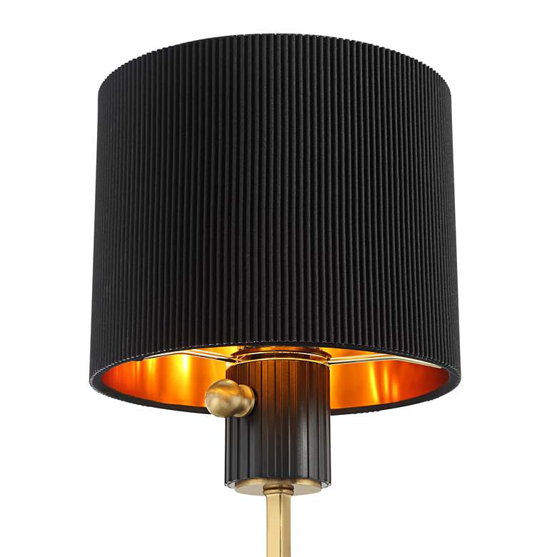 - Gold and black finish. Black pleated linen fabric Uno fitter drum shade with gold interior lining.