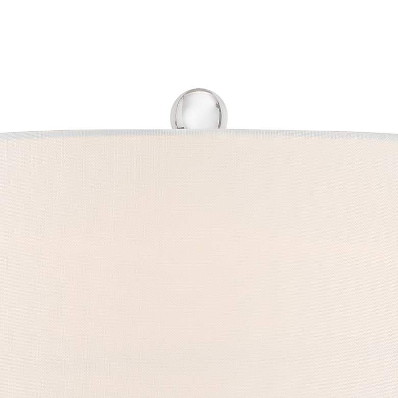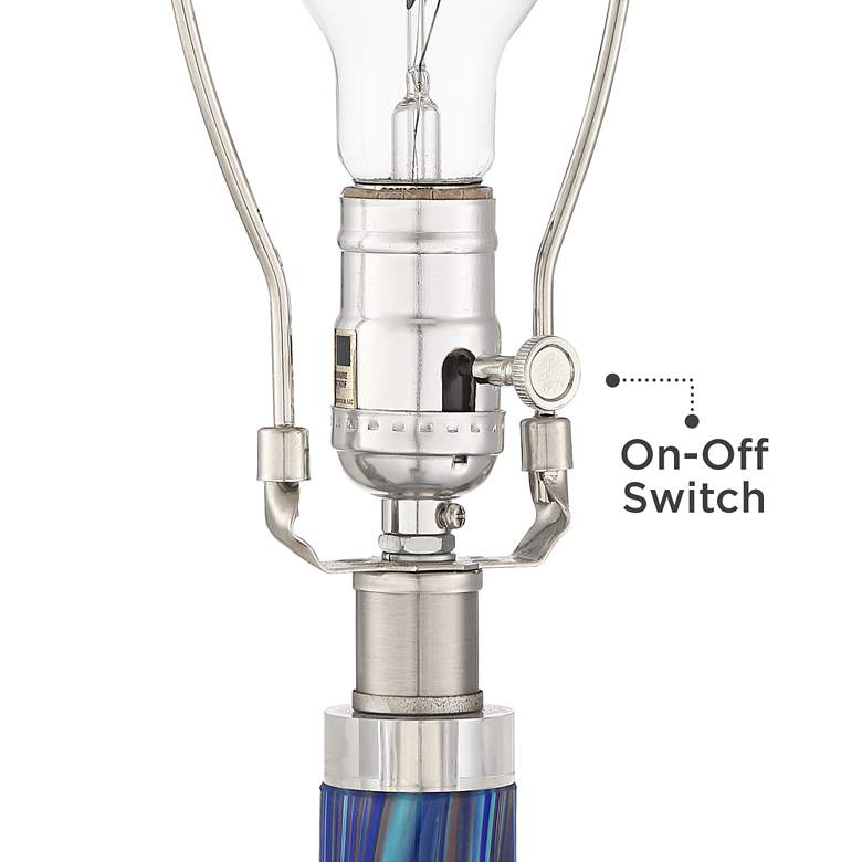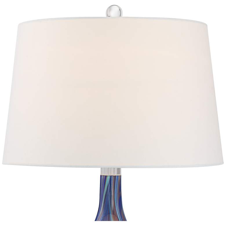 Embrace artistic expressionism with the stunning pattern on these glass table lamps. The set of two lamps is from the Possini Euro Design® brand. Each lamp has a teardrop-shaped silhouette base in blue art glass. The glass has a swirling pattern of blue and colored lines which play off the silver metal accents and the tapered white drum shades up top. Please note that the glass is handcrafted, so there may be slight variations in color and pattern.